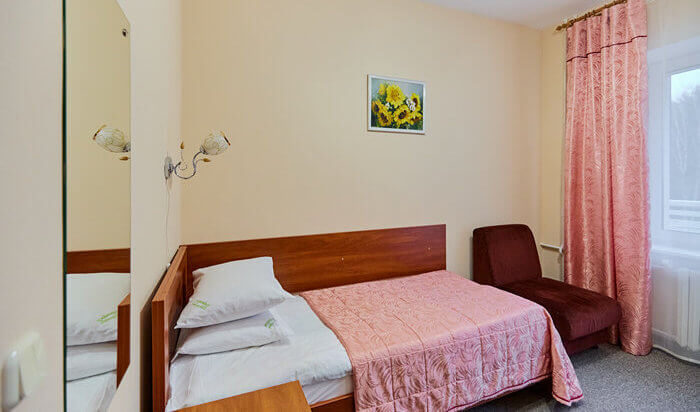 Одноместный однокомнатный номер на 2-4 этаже. Мебель: кровать односпальная, набор мягкой мебели, стол, стул, шкаф; Оборудование: телевизор, телефон, холодильник, электрочайник.