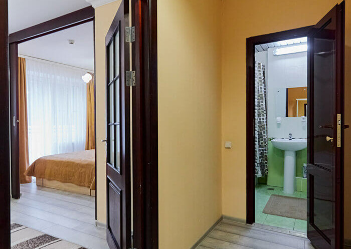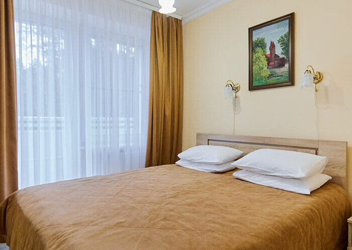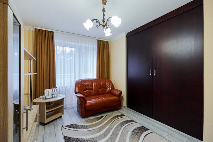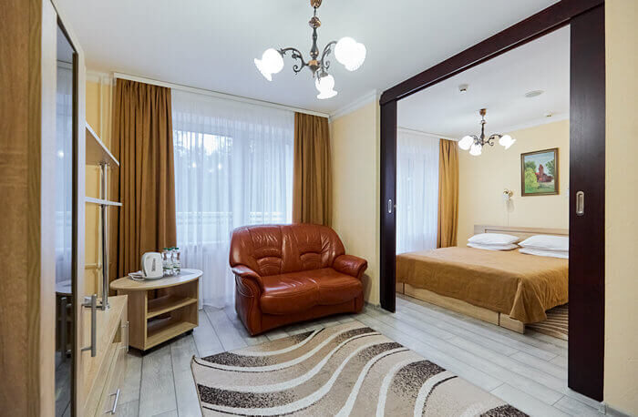 Двухкомнатный улучшенный номер. Оснащение номера: кровать двуспальная, набор мягкой мебели, прикроватные тумбочки, стол, стулья, шкаф, телевизор, холодильник, электрочайник.