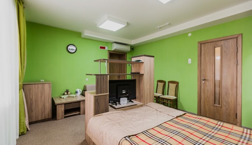 Одноместный стандарт с балконом. Оснащение номера: зеркало, кресло, кровать двуспальная, прикроватные тумбочки, стол, стул, шкаф, кондиционер мини-холодильник, набор посуды, телевизор ЖК, чайный набор посуды, электрочайник.