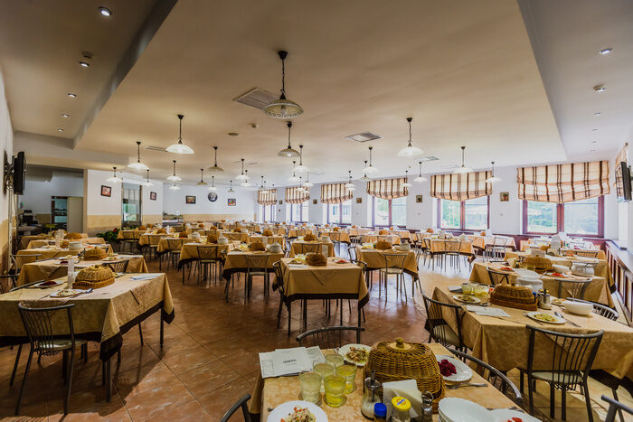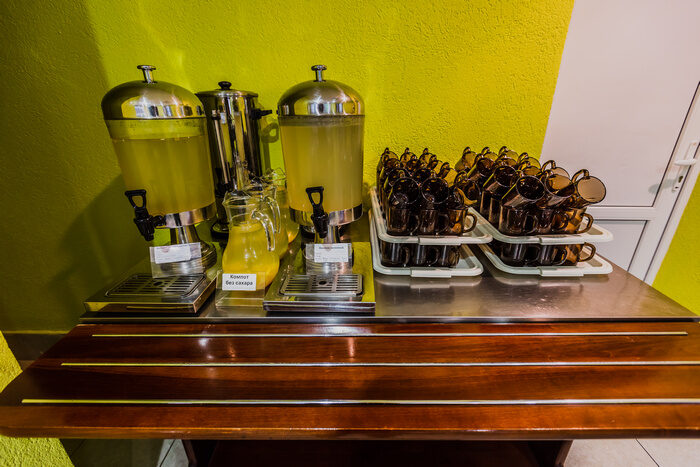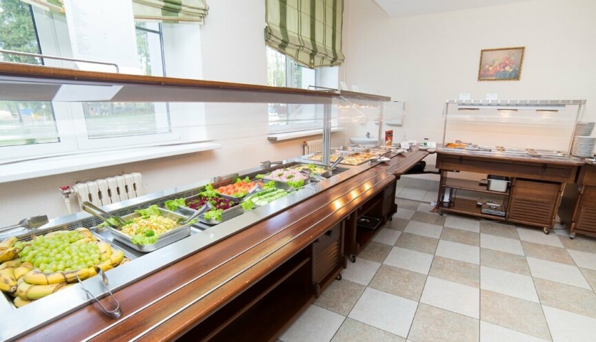 В санатории имеется обеденный зал для питания по системе «меню-заказ» на 140 человек (заказ блюд принимается со второго дня пребывания ) и обеденный зал для питания по системе «шведский стол» на 80 человек